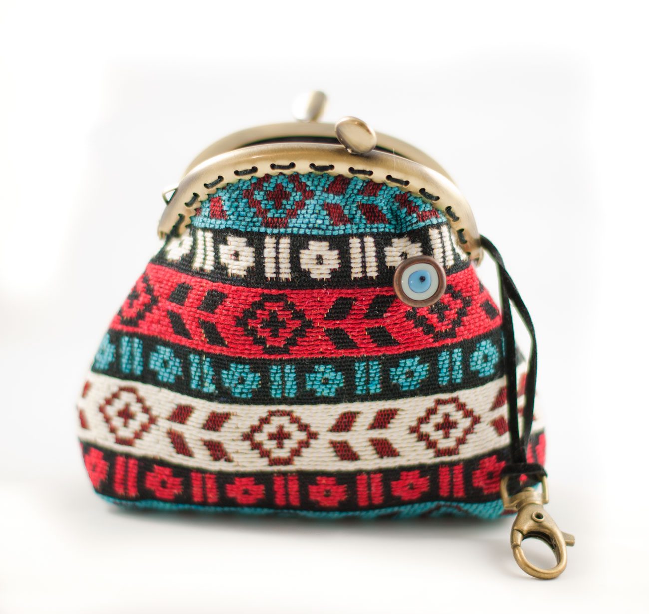 Monedero con boquilla cake cosida a mano, en su interior lleva un cuelga llaves y un bolsillo.