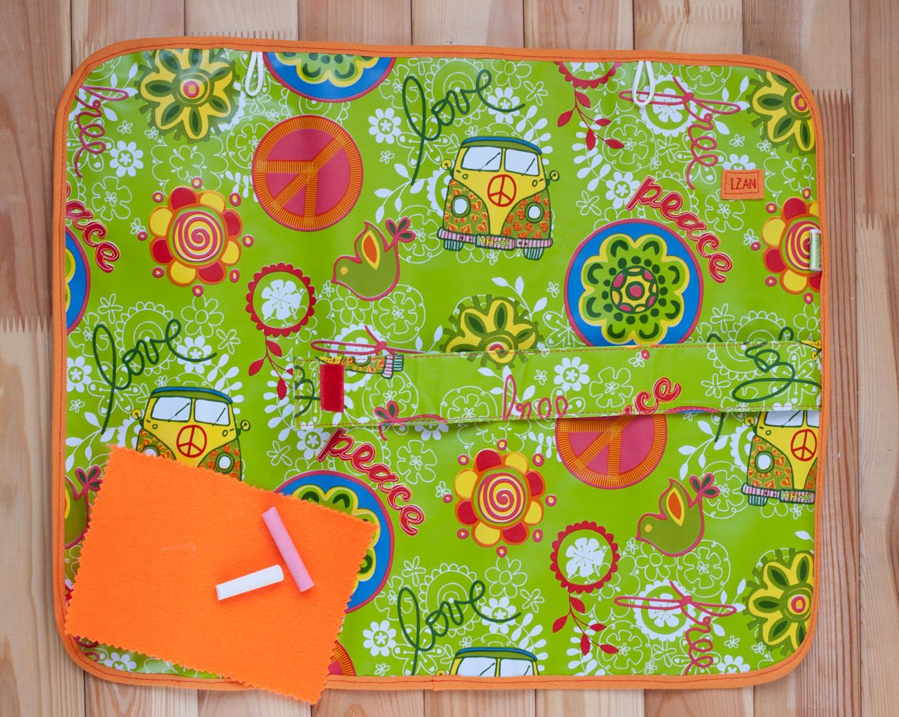 Pizarra enrollable para poder llevarla en el bolso. Con un estuche de cremallera para las tizas y un trapito (incluidos). Lleva unas cintas para poder colgarla en la pared de manera horizontal o vertical. Cierre con tira y velcro.